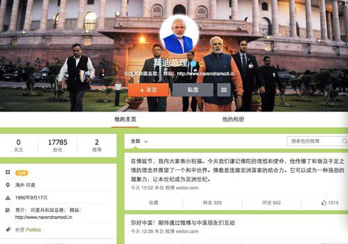 據(jù)新浪微博一位負(fù)責(zé)人介紹,莫迪一直很重視社交媒體平臺,在中國開通微博,是為了加強(qiáng)與中國網(wǎng)友的溝通。此外,莫迪也是印度第一位在微博開通賬號的高級官員。