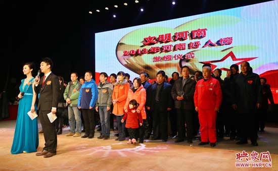 1月8月晚,“文明河南——2013年度《河南好人榜》發(fā)榜儀式”圓滿舉行,100名“河南好人”走上前臺,講述他們的感人故事。河南省委宣傳部常務(wù)副部長王耀、副部長李宏偉,省文明辦專職副主任郭守占,省廣電局副局長王仁海等到領(lǐng)導(dǎo)嘉賓出席了儀式。