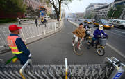 2014年4月2日,北京長安街上多個路口增設了封機動車護欄,紅燈時非機動車護欄拉起,防止非機動車闖紅燈。圖為綠燈亮起,護欄打開正常通行。
