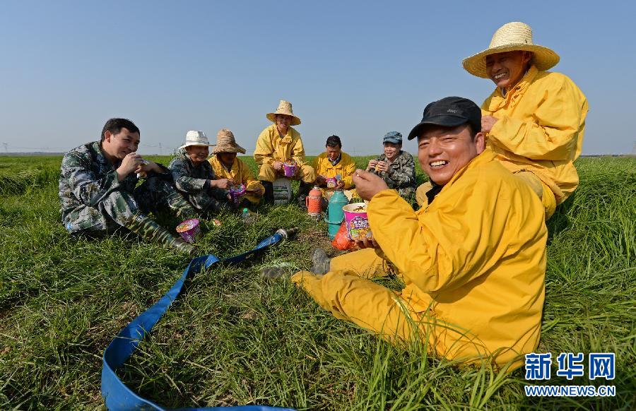 滅螺隊(duì)員在草洲上吃自帶的方便面和干糧(4月14日攝)。 新華社記者 萬象 攝
