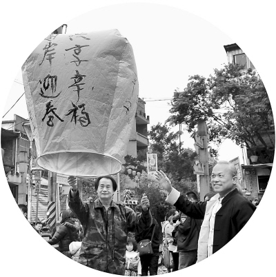 近日,臺(tái)灣毫芒雕刻家陳逢顯(右)與傳統(tǒng)天燈工藝大師林國(guó)和(左)一起放飛寫有“兩岸迎春· 共享幸?!钡奶鞜簟P卤笔衅较獏^(qū)放天燈久負(fù)盛名,已有百余年歷史。 王東明攝