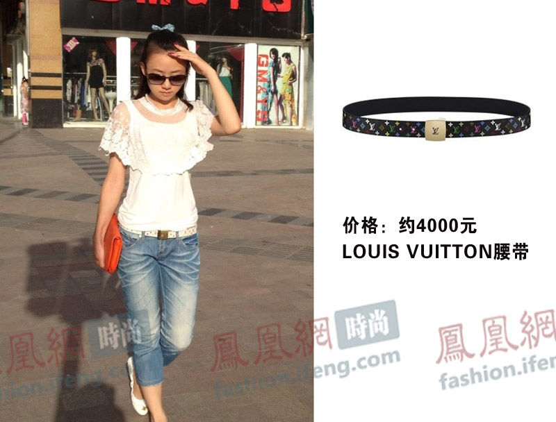 帆布質(zhì)料的LV腰帶。姑娘,拜托把頭上的頭花拿下來吧,土??!