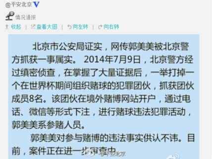 2014年7月10日,據法制晚報播報:據線報,郭美美因賭球被北京警方抓了!