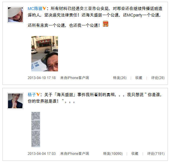 近幾日,三亞“海天盛筵”涉黃,淫亂派對的新聞可謂瘋傳網(wǎng)絡(luò)。早前有媒體報(bào)道,三亞市委宣傳部曾于4月4日向媒體發(fā)布新聞通稿,稱已經(jīng)對網(wǎng)上有關(guān)“海天盛筵聚眾淫亂”傳聞?wù)归_調(diào)查,對此事非常重視。三亞警方今日已正式通知“海天盛筵”主辦方三亞鴻洲國際游艇會、“MC白色派對”主辦方MC俱樂部等相關(guān)單位負(fù)責(zé)人于4月8日面談,配合調(diào)查工作。今天,“海天盛筵”主辦方之一,候鳥俱樂部負(fù)責(zé)人陳駿發(fā)微博稱,自己已經(jīng)將所有材料遞交三亞市公安局,將對那些還在繼續(xù)傳播詆毀造謠的人,堅(jiān)決追究法律責(zé)任。希望可以還海天盛筵一個(gè)公道。