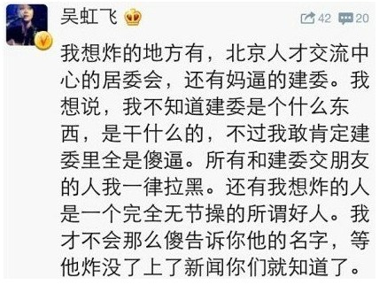 吳虹飛發(fā)表的不當(dāng)微博言論是:“我想炸的地方有北京人才交流中心的居委會(huì),還有媽逼的建委。我想說,我不知道建委是什么東西,是干什么的,不過我敢肯定建委里全是傻逼。所有和建委交朋友的人我一律拉黑。還有我想炸的人是完全無節(jié)操的所謂好人。我才不會(huì)那么傻告訴你他的名字,等他炸沒了上了新聞你們就知道了?!?/p>