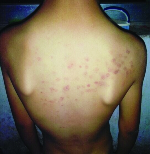 10月8日,謝女士在給小韋洗澡時(shí),發(fā)現(xiàn)孩子的后背上都是紅斑,像是被什么硬東西戳傷的。從謝女士提供的照片可以看到,小韋的后背上是成片的紅斑,記者粗略地?cái)?shù)了一下,紅斑超過50個(gè)?!爱?dāng)時(shí)我問他是怎么搞的,孩子也不說,我以為是在學(xué)校玩摔倒弄的,就沒再追問。”