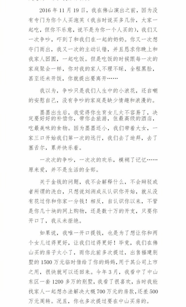 5月23日凌晨,劉洲成發(fā)微博回應家暴致前妻林苗流產(chǎn)及要求前妻出錢買房等傳聞。劉洲成更是曬出了昔日的聊天記錄、代付清單、借記卡賬戶歷史明細清單等證據(jù),疑似反駁前妻所述不實。劉洲成長文截圖6 劉洲成長文截圖7