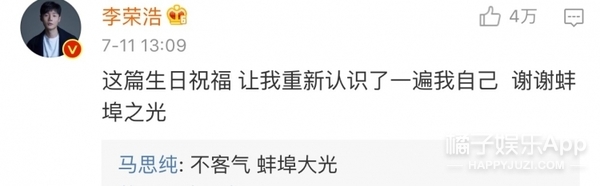 隨后李榮浩就在底下評(píng)論說(shuō)馬思純的這篇生日祝福讓他重新認(rèn)識(shí)了自己,還稱她為“蚌埠之光”。而馬思純也回復(fù)他說(shuō)“不客氣,蚌埠大光?!?/p>