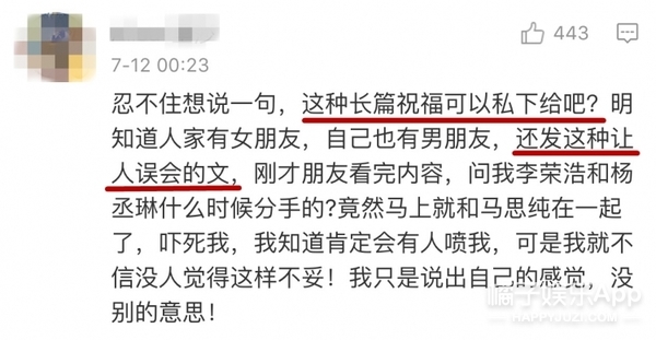 然而,評(píng)論的畫風(fēng)走向有點(diǎn)讓人意外。不少網(wǎng)友認(rèn)為馬思純有歐豪了,李榮浩也有楊丞琳了,這種長(zhǎng)文祝福信不應(yīng)該公開(kāi)發(fā)↓