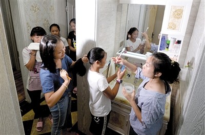 15分鐘的總結(jié)會很快結(jié)束,孩子們各自洗漱后去房間就寢。記者看到,每個房間要住6個人,除了床鋪上可睡下4個人外,剩下的兩個男生打地鋪,兩個女生則睡在飄窗上。