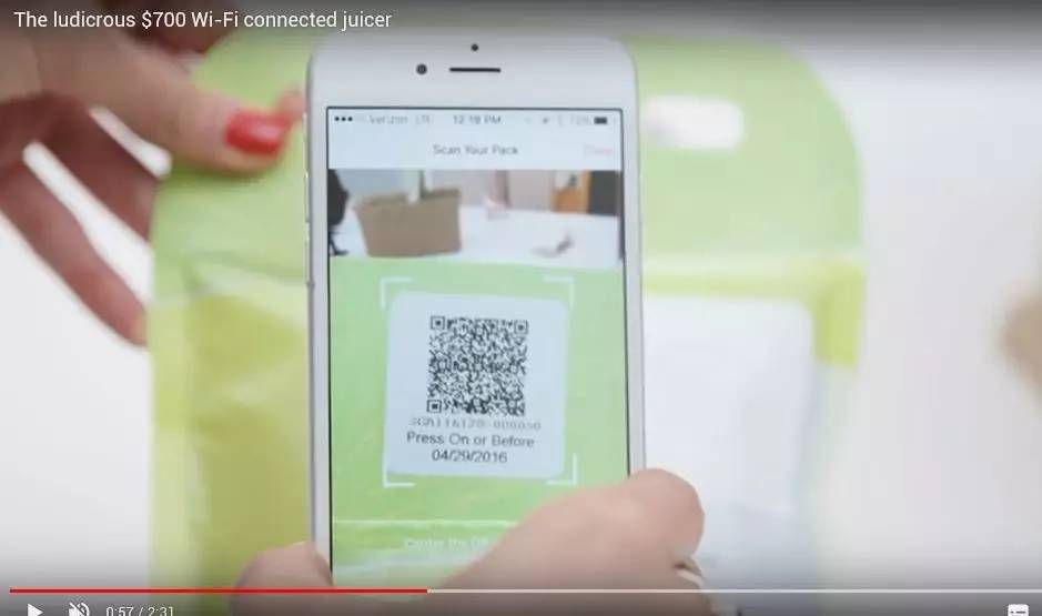 此外,這些主打互聯(lián)網(wǎng)概念的“果汁材料包”還有二維碼可供掃描。用戶(hù)掃碼之后,手機(jī)上可顯示出材料包內(nèi)商品的生產(chǎn)信息。并且聯(lián)網(wǎng)后的智能榨汁機(jī)還可以讀取這些信息。如果有變質(zhì)、過(guò)期的不新鮮材料包被投入機(jī)器,榨汁機(jī)將拒絕工作。