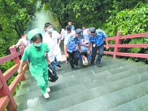 盧先生繼續(xù)攙扶著妻子往山下走。當(dāng)他們走到離山腳還有900米時,遇到了兩名前來施救的輔警,兩人在兩名輔警的攙扶下,繼續(xù)慢慢向山下走去。走到離山腳約600米距離時,120急救人員、景區(qū)工作人員及兩名輔警也趕來了。醫(yī)護人員對他們進行了檢查和包扎后把王女士抬上擔(dān)架。王女士一邊輸液一邊被抬下山。40分鐘后,終于到達山下,王女士被送往醫(yī)院救治。