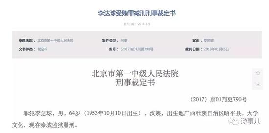 1月9日,北京市法院審判信息網公布了李達球受賄罪減刑刑事裁定書,他被減去有期徒刑7個月。