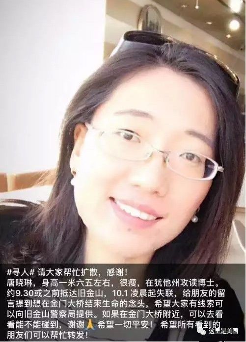 2017年10月,一則關(guān)于失蹤中國女留學(xué)生的尋人信息在美國引發(fā)關(guān)注:一名畢業(yè)于北京大學(xué)2004級空間物理專業(yè),在美國猶他州大學(xué)做導(dǎo)師助理研究員的唐曉琳在舊金山失聯(lián)。