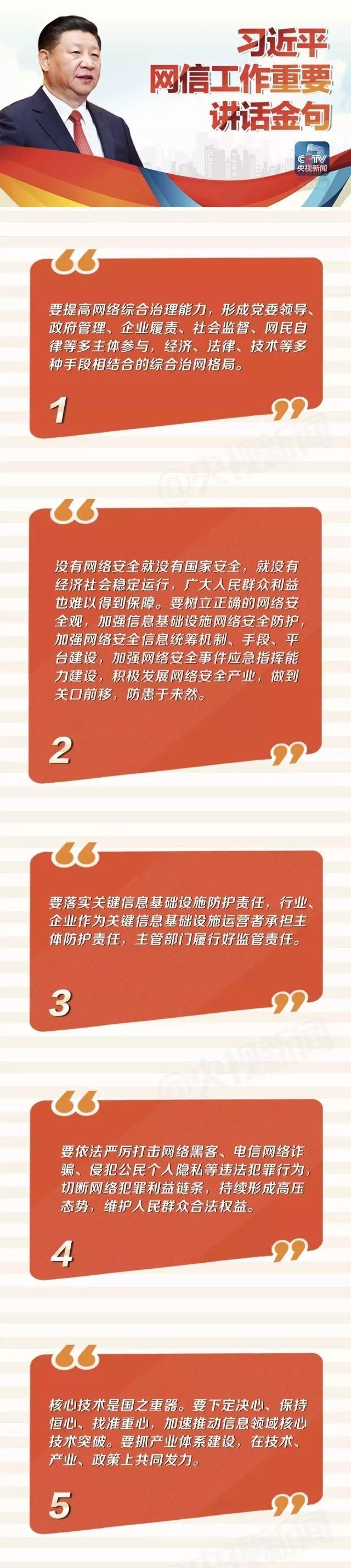 習(xí)近平總書記重要講話站在人類歷史發(fā)展和黨和國家全局高度,科學(xué)分析了信息化變革趨勢和我們肩負(fù)的歷史使命,系統(tǒng)闡述了網(wǎng)絡(luò)強(qiáng)國戰(zhàn)略思想,深刻回答了事關(guān)網(wǎng)信事業(yè)發(fā)展的一系列重大理論和實踐問題,是指導(dǎo)新時代網(wǎng)絡(luò)安全和信息化發(fā)展的綱領(lǐng)性文獻(xiàn)。一定要認(rèn)真學(xué)習(xí)領(lǐng)會,把思想和行動統(tǒng)一到黨中央關(guān)于網(wǎng)信工作的戰(zhàn)略部署上來,以釘釘子精神把各項工作抓實抓到位。