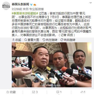 [環(huán)球網(wǎng)快訊 記者 趙衍龍]泰國頭條新聞7月9日消息,泰國副總理巴逸上將在總理府就普吉沉船事件對外宣稱:經(jīng)過警方調(diào)查,翻船造成40多名中國游客死亡的普吉租船旅行社幕后老板為中國人,此旅行團(tuán)為非法的“零元團(tuán)”。