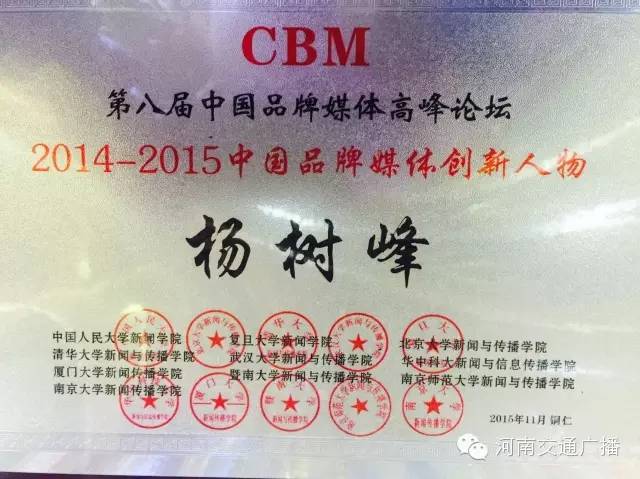 本屆論壇上,河南交通廣播總監(jiān)楊樹峰榮獲2014-2015中國品牌媒體創(chuàng)新人物稱號,這是對他個人成就的肯定,更體現(xiàn)了河南交通廣播運管機制的成功,人文關(guān)懷、扁平化管理,民主決策、智慧碰撞,從決策層發(fā)出的指令,成為掌控河南交通廣播精準(zhǔn)運行,走向成功的靈魂,而我們一切的努力,都是為了實現(xiàn)一個目標(biāo):無論何時、何地,無論現(xiàn)在、未來,伴你出行每一刻。