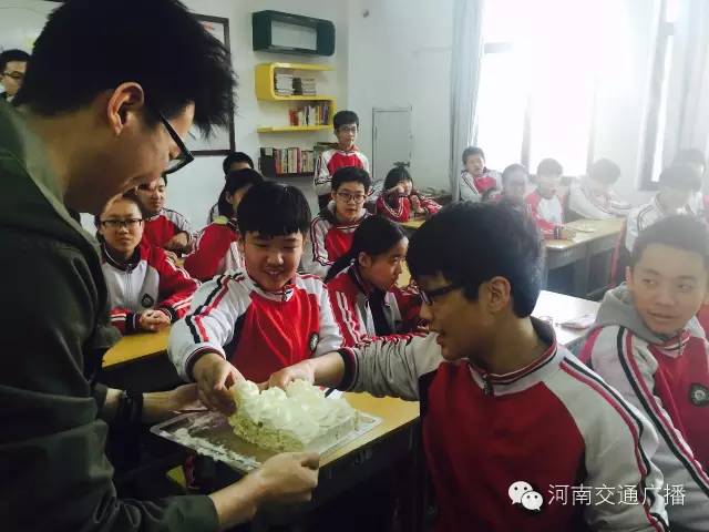 班主任李少鋒老師很激動,他說,沒想到一條小小的微信,竟然真的請到了河南交通廣播主持人來給同學(xué)們送蛋糕,他說,這樣的班會開得很有意義,讓孩子們學(xué)會分享,是與同學(xué)們心貼心的交流。