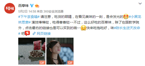 電視劇里收獲滿滿焦點,宣傳上,也要給力才行。在廣大觀眾們忙著截圖曬圈時,百草味的官方微博也沒閑著。電視劇播到哪,小編的截圖就跟到哪。緊跟劇情的同時附上店鋪鏈接,讓流量順利轉(zhuǎn)化為銷量。