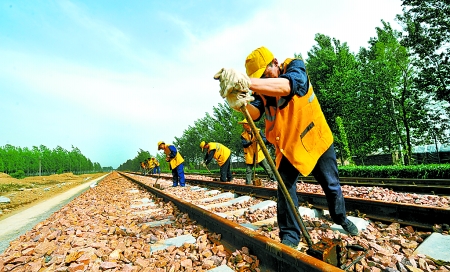 4月27日,我省鐵路工人正在山西中南部鐵路大通道河南濮陽(yáng)段施工現(xiàn)場(chǎng),對(duì)剛鋪設(shè)的道軌進(jìn)行修整。該鐵路大通道濮陽(yáng)段自開(kāi)工以來(lái)已完成投資31.68億元,完成路基土石方889.89萬(wàn)方、橋梁21026米、涵洞5802米、鋪軌166公里。該鐵路建成通車后將成為我國(guó)第一條真正意義上的重載鐵路。高 林 劉榮莉 攝
