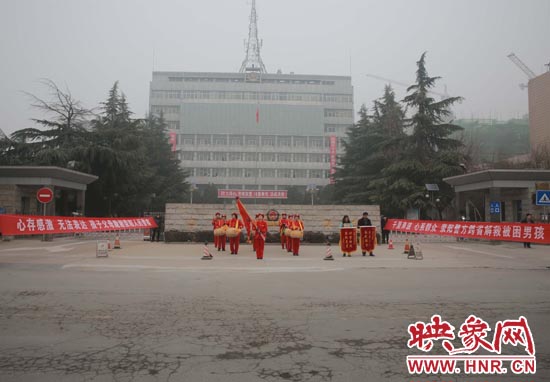 為了表達對滎陽警方的感激之情,20日上午8時許,盧女士就和家屬一起來到滎陽市公安局大門口,敲鑼打鼓地舉著兩面錦旗表示感謝。映象網(wǎng)記者看到,在公安局大門兩側(cè),有兩個紅色條幅格外顯眼,“千里奔波,心系群眾,滎陽警方跨省解救被困男孩”,“心存感激,無法表達,孩子父母跪謝滎陽人民警察”。