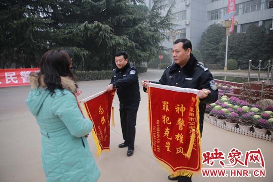 映象網(wǎng)訊(記者 王文凱 通訊員 牛智瑞 薛勇)滎陽17歲男孩盧健(化名)在被困傳銷窩點21天后,滎陽警方跨省將其營救。20日上午8時許,心存感激的孩子父母及親屬敲鑼打鼓來到滎陽市公安局,把“匡扶正義,為民服務(wù)”“神警雄風,罪犯克星”,兩面錦旗贈給公安局,局長夏日紅和政治部主任楚宏偉親自從家屬手中接過兩面錦旗。無法表達內(nèi)心感激之情的盧女士拿出兩萬元現(xiàn)金要對專案組民警表示謝意,遭到夏日紅局長拒絕。