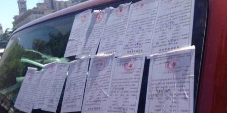 一輛紅色越野車(chē)上被10余張罰單覆蓋,引來(lái)不少市民圍觀。擋風(fēng)玻璃、后視鏡、前門(mén)的車(chē)窗上都被交警的罰單糊住了。