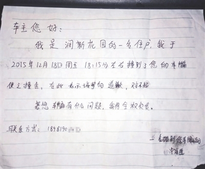 事情發(fā)生在12月18日。柏宇告訴成都商報(bào)記者,當(dāng)天下午她外出買了冒菜回家,走到小區(qū)門口,一不留神撞到了旁邊一輛轎車的車頭,彎腰擦膝蓋時(shí)發(fā)現(xiàn),轎車車牌面板被撞彎了。隨后,她跑回家寫了一張字條然后把字條貼到了轎車擋風(fēng)玻璃上,“車主您好,我是潤(rùn)新花園的一名住戶,我于2015年12月18日周五18點(diǎn)15分左右撞到了您的車牌,使之撞歪,在此表示誠(chéng)摯的道歉,對(duì)不起,若您的車牌有什么問(wèn)題,我將全權(quán)負(fù)責(zé)”,她還留下了手機(jī)號(hào)碼。