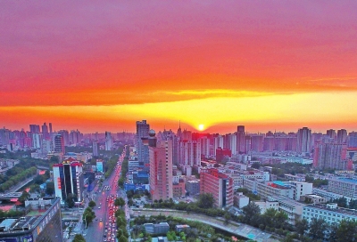 不怕蘑菇云,就怕火燒云。蘑菇云含雨,火燒云兆熱。昨天,在度過(guò)了一個(gè)悶熱熏蒸的白天后,鄭州的天空到了傍晚,煮起了紅色的晚霞,黃的紅的云,在西半天蒸騰著。本已打算拉上黑幕的夜晚,返照回光,天地大亮。