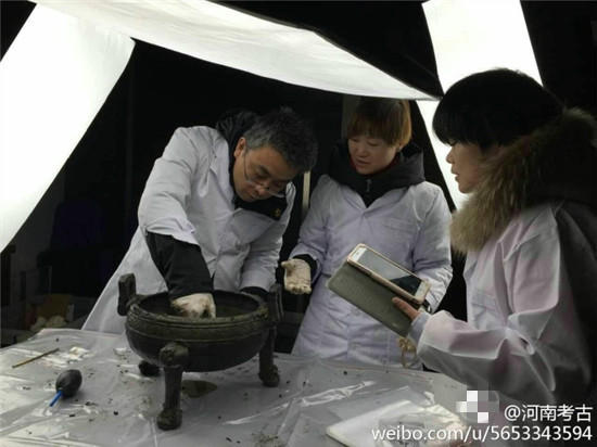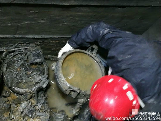 據(jù)@河南考古 微博消息,近日在河南一座古墓發(fā)掘現(xiàn)場(chǎng),出土了幾只裝有“肉湯”大鼎,。