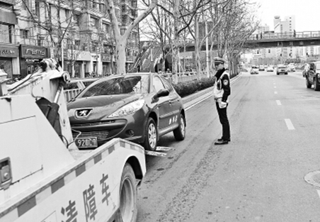 金水路已開(kāi)啟嚴(yán)管模式,交警對(duì)路邊違停車輛進(jìn)行拖移。