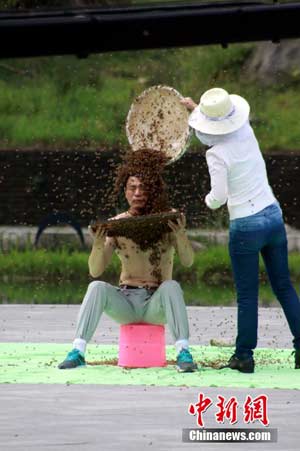 5月13日,“吉尼斯中國之夜”在江西宜春明月山明月廣場舉行。江西“第一蜂人”、宜春市奉新縣養(yǎng)蜂人阮良明挑戰(zhàn)“人體肩部以上布滿蜜蜂堅(jiān)持時(shí)間最長”吉尼斯世界紀(jì)錄。最終,吉尼斯認(rèn)證官宣布,阮良明的人體肩部以上布滿蜜蜂堅(jiān)持時(shí)間為53分34秒,成功創(chuàng)造了吉尼斯世界紀(jì)錄。鄒海斌 攝