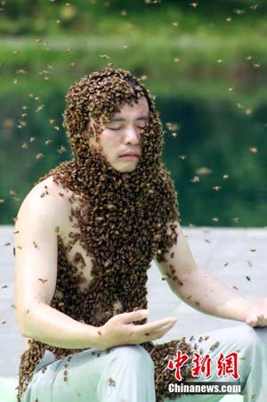 圖為江西“第一蜂人”阮良明靜坐挑戰(zhàn),上身已布滿密密麻麻的蜜蜂。鄒海斌 攝