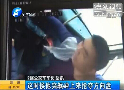 監(jiān)控顯示,鄭州2路公交車正常行駛中,突然一男子沖上來猛拉方向盤,并與公交車長廝打在一起。男子將車長狠狠地壓在方向盤上,無法動彈。而其動手的原因竟是因為坐過了站,車長沒有及時給他開門。事后,民警對此事進(jìn)行了調(diào)解。