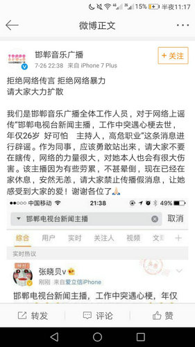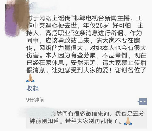 微博上暈倒的女主播為《邯鄲新聞》主播,在主持當(dāng)?shù)匾豁棸l(fā)布活動時因勞累而暈倒在地,并被網(wǎng)友拍了視頻發(fā)在網(wǎng)上,稱其猝死。為此,彤彤特意發(fā)了一條朋友圈來辟謠,提醒大家不要傳謠以免給本人造成傷害。