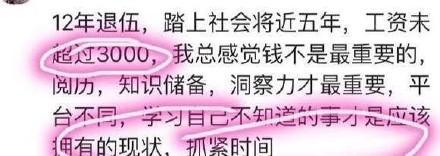 12年退伍,在社會上5年,工資未超過3000元,但是感覺錢不是最重要的,只是儲備,洞察力才重要,學習自己不知道是才是應(yīng)該有的狀態(tài)。