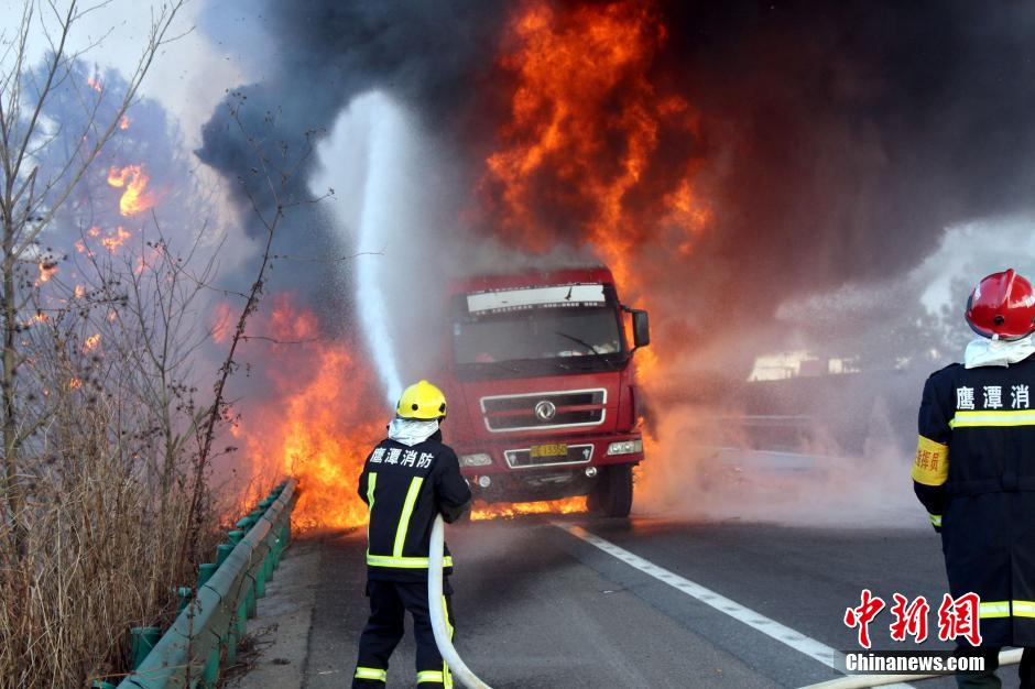 1月23日下午16時(shí)許,滬昆高速公路江西弋陽往貴溪方向593公樁(貴溪收費(fèi)站附近)一輛載有133部電動車的半掛車起火,導(dǎo)致電動車被大火“吞噬”。江西貴溪消防官兵接警后迅速到場撲救,半小時(shí)后將大火撲滅。據(jù)司機(jī)稱,火災(zāi)疑因高速護(hù)坡雜草叢起火產(chǎn)生的火芯飄至半掛車,引燃包裝電動車的紙殼箱所致。中新社發(fā) 龔武 攝