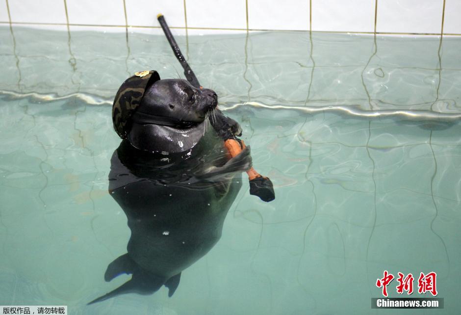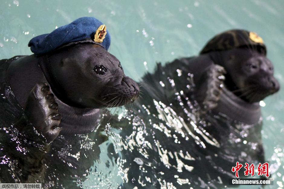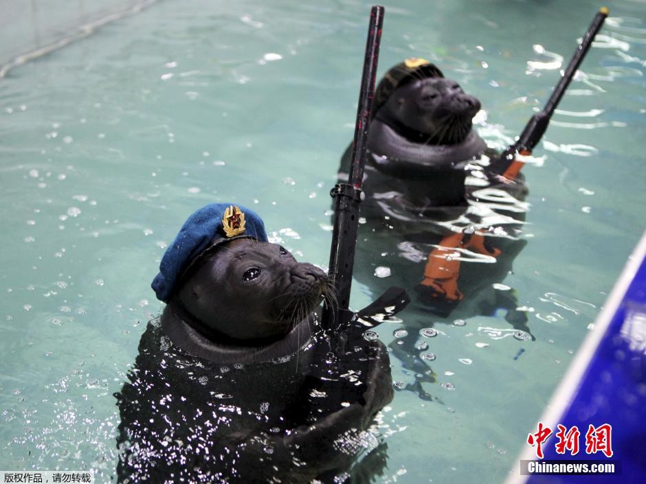 當(dāng)?shù)貢r(shí)間5月9日,莫斯科紅場(chǎng)舉行盛大閱兵式慶祝衛(wèi)國(guó)戰(zhàn)爭(zhēng)勝利70周年。在俄羅斯的伊爾庫茨克水上公園里,海豹們也身著“軍裝”認(rèn)真的在水中列隊(duì)接受訓(xùn)練員的檢閱。