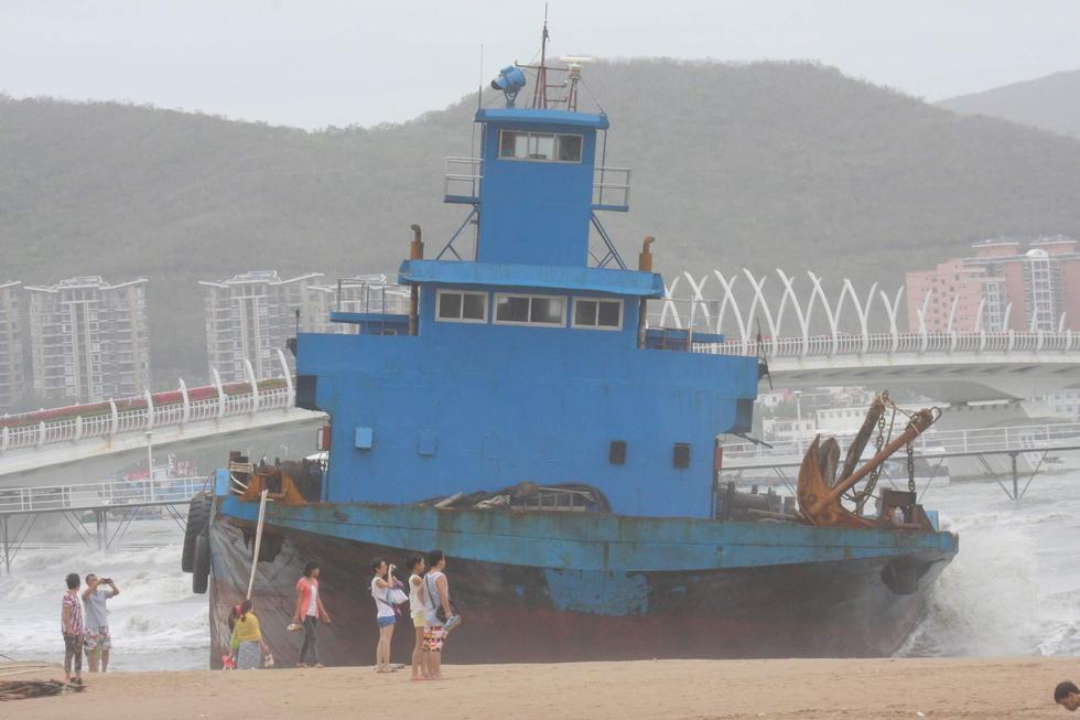 2015年6月23日,海南三亞,“鯨魚”臺風襲擊海南省萬寧市,三亞海面大風大浪,2艘大型貨輪和一艘旅游船,被刮到了三亞灣沙灘上。