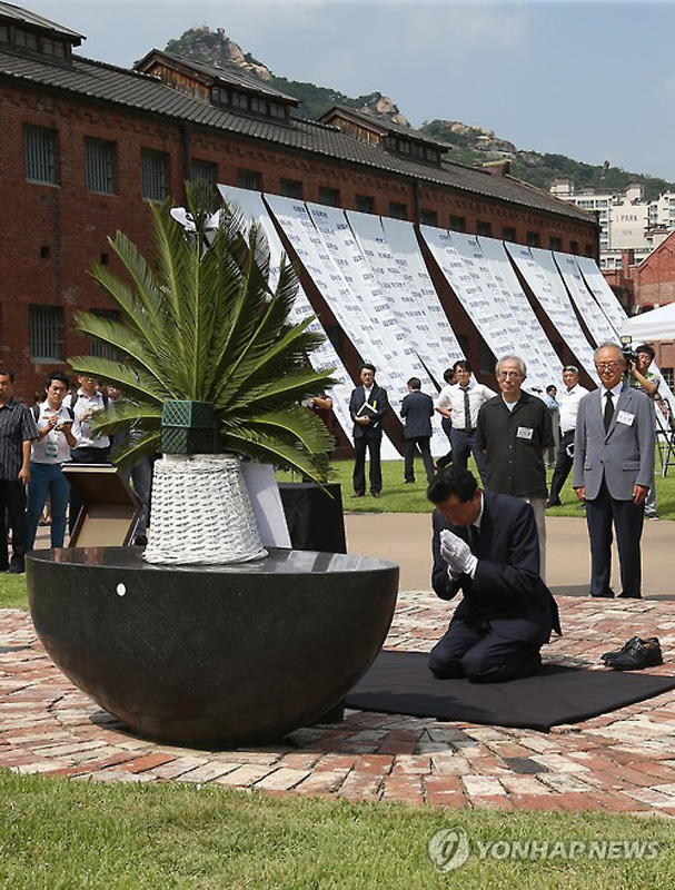 當(dāng)?shù)貢r(shí)間2015年8月12日,正在韓國訪問的日本前首相鳩山由紀(jì)夫參觀了首爾“西大門刑務(wù)所”博物館,并在追悼碑前跪地禱告。據(jù)悉,西大門刑務(wù)所始建于1908年,用于關(guān)押反抗日本殖民統(tǒng)治的韓國抗日義士。鳩山由紀(jì)夫表示,日本理應(yīng)承認(rèn)殖民侵略歷史。(圖片來源:網(wǎng)絡(luò))