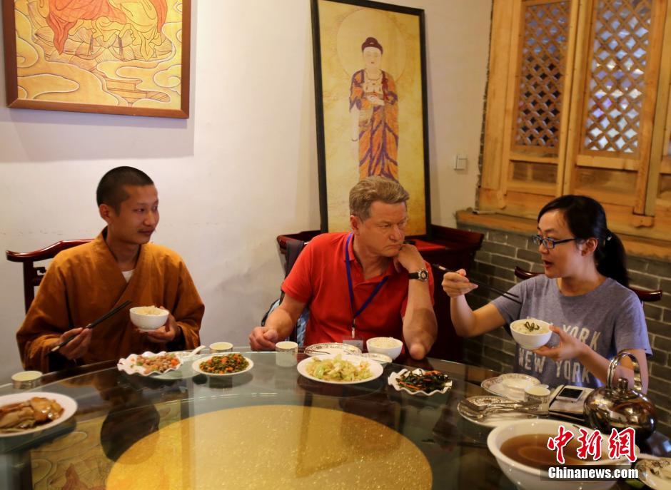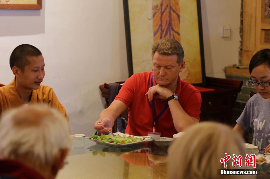 9月20日,河南登封少林寺,立陶宛前總統(tǒng)、現(xiàn)歐盟議員、國際特技飛行員羅蘭達(dá)斯·帕克薩斯與參加2015鄭州航展的明星隊員們參訪少林寺。羅蘭達(dá)斯在少林寺里吃齋飯。中新社發(fā) 王中舉 攝