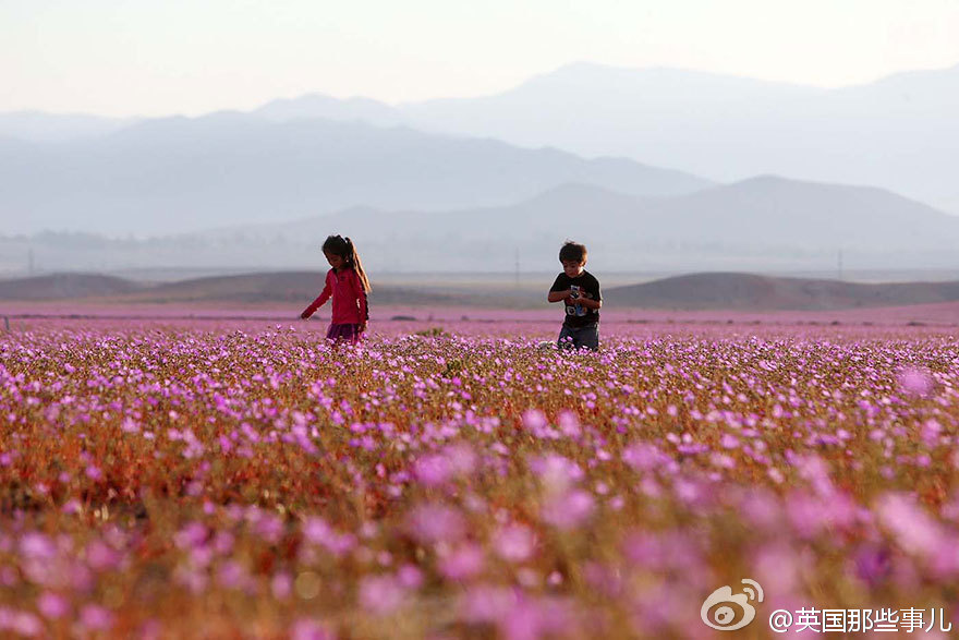智利阿塔卡馬沙漠本是世界上最干燥的沙漠,今年的厄爾尼諾現(xiàn)象帶來了一場超乎以往的大雨,沙漠土地里休眠的各種花朵種子瞬間發(fā)芽、生長、開花,在這以往死寂的沙漠綻放。