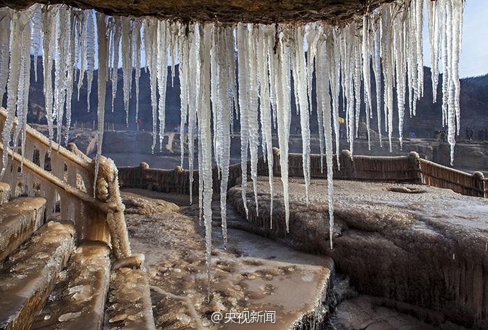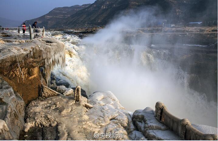 據(jù)中央電視臺(tái)新聞中心官方微博12月26日?qǐng)?bào)道,近日受持續(xù)降溫影響,黃河壺口瀑布出現(xiàn)冰掛美景。這些冰掛都是黃河水從瀑布傾瀉而下,冒起的水霧迅速凍結(jié)而成。依懸瀑布兩岸的冰掛晶瑩剔透、造型各異,有的像龍須,垂懸在巖石上;有的如無暇白玉,鑲嵌在河岸旁。(央視記者王志杰 圖片來源:中央電視臺(tái)新聞中心官方微博)