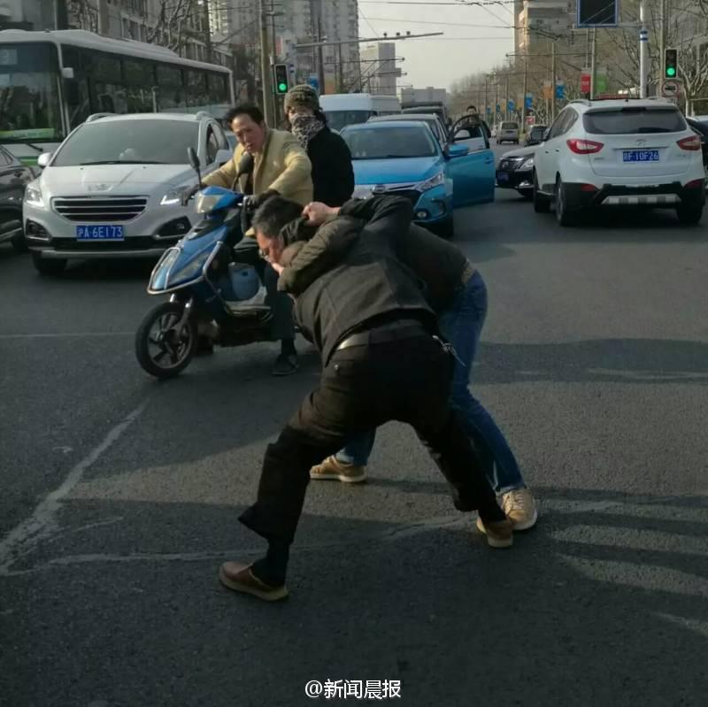 晨報(bào)訊 你一個(gè)過肩摔,我一個(gè)橫掃腿,接著扭打在一起,互相纏斗難分伯仲……這幕刺激的武打動(dòng)作場景,昨天早高峰時(shí)在上海安波路營口路上演,而沖突竟源于“路怒”!目擊者肖先生告訴記者,昨天上午8點(diǎn)不到,他經(jīng)過安波路、營口路路口時(shí),看看兩名男子扭打在一起,場面十分激烈。“我順勢拿出手機(jī)拍了幾張照片,旁邊也有行人上去勸架。”肖先生說,在兩名男子的身旁,一橫一豎停著兩輛轎車,“我想可能是兩個(gè)人開車有點(diǎn)摩擦引起的‘路怒’吧?!?/font>