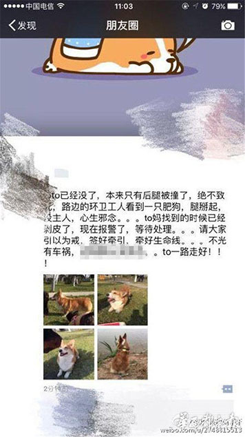 據(jù)主人李女士講述,“早上8點(diǎn)20分左右,我媽媽帶狗出去散步,它跟著別的狗跑丟了。我們找了很久?!崩钆空f(shuō),小狗跑丟后,在成都一愛(ài)寵微信群里,有群友稱在三環(huán)路上看到過(guò)它,“說(shuō)是它橫穿三環(huán)路,把后腿撞到了,它就沿著三環(huán)路跑了?!眻D為李女士在朋友圈發(fā)布的尋狗信息。