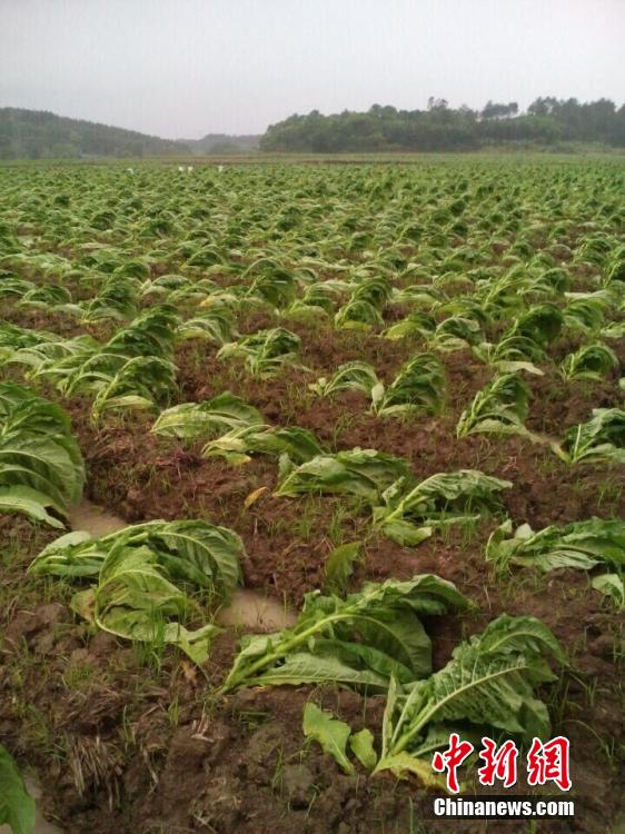 5月4日至5日,地處湘南的永州市道縣遭遇龍卷風(fēng)和暴風(fēng)雨襲擊,部分鄉(xiāng)鎮(zhèn)的樹木被大風(fēng)攔腰折斷或連根拔起,46個行政村電力中斷,當季農(nóng)作物特別是烤煙大面積受災(zāi)。目前,該縣已迅速組織2000余名各級干部,深入災(zāi)區(qū)組織搶險救災(zāi)。圖為龍卷風(fēng)過后烤煙大面積倒伏。 道縣宣傳部 供圖
