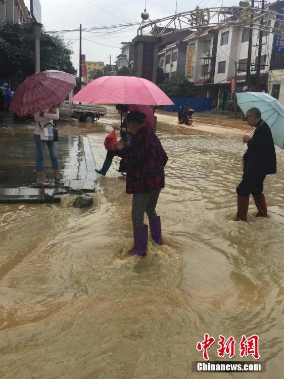 5月5日,地處湘南的永州市道縣遭遇暴風(fēng)雨襲擊,縣城內(nèi)多處低洼路段被水淹沒。當?shù)胤姥床块T正嚴密監(jiān)控雨情、水情,確保安全度汛。圖為市民趟水出行。 中新社發(fā) 何紅福 攝
