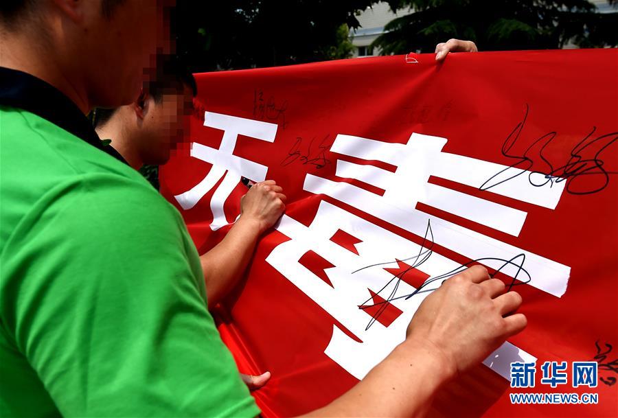 6月22日,河南省未成年人強(qiáng)制隔離戒毒所內(nèi)的戒毒人員在“無(wú)毒青春健康生活”條幅上簽名。新華社記者 李安 攝