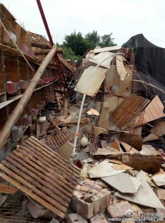 7月12日凌晨5時(shí)許,陣性大風(fēng)突襲四川自貢榮縣古文鎮(zhèn),風(fēng)災(zāi)使古文鎮(zhèn)山邊村鄉(xiāng)巴佬養(yǎng)殖基地6000平米兔舍垮塌,事發(fā)時(shí),該兔舍共有26000只兔子。記者在現(xiàn)場(chǎng)看到,兔舍頂棚已經(jīng)被完全吹跨,木制橫梁和隔板隨處散落,部分兔舍仍有大量兔子被埋,10余名工人正在清理現(xiàn)場(chǎng)和搶救活兔。據(jù)兔舍負(fù)責(zé)人介紹,經(jīng)過(guò)近30多小時(shí)生產(chǎn)自救已搶救出5000余只活兔,初步估計(jì)有10000余只兔子死亡,直接損失超過(guò)300萬(wàn)元。(記者 曹實(shí)秋)圖片來(lái)源:華西都市報(bào)自貢城市頻道官方微博