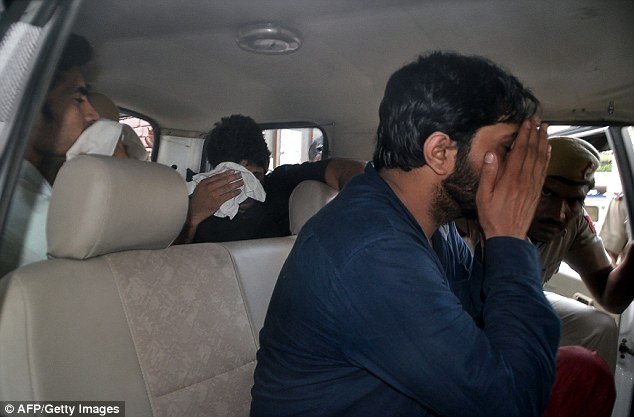 受害女子稱:“我離開學(xué)校,看見了他們,相同的5個(gè)人。我非常害怕。”受害人告訴當(dāng)?shù)匾患译娨暸_(tái),“他們強(qiáng)迫我進(jìn)入車?yán)?,試圖扼死我。他們威脅說要?dú)⑺牢业母赣H和兄弟?!眻D為3名涉嫌強(qiáng)奸女子的嫌疑人被捕時(shí),用手遮住臉。